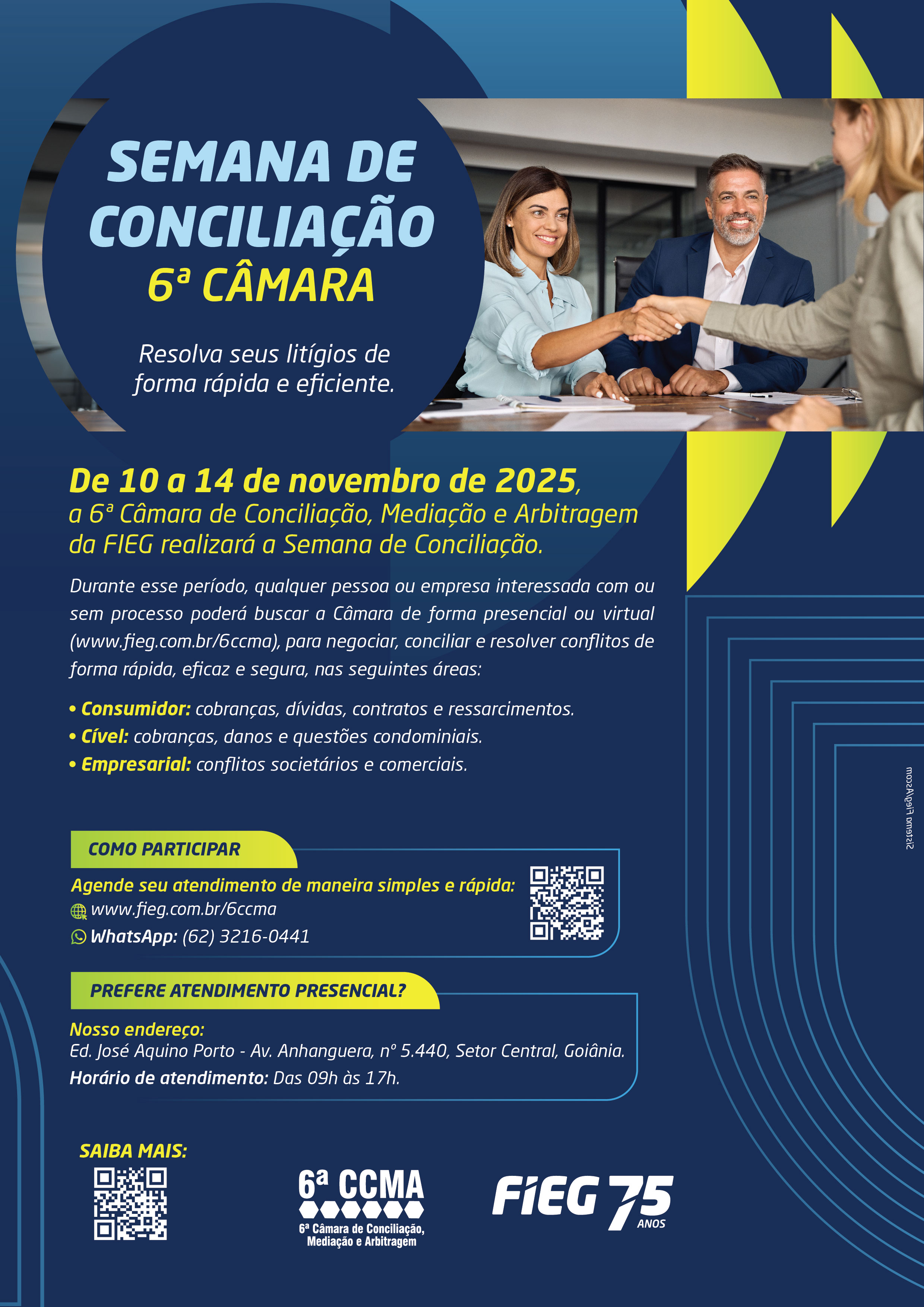 A 6ª CCMA, criada pela Fieg, atua há mais de duas décadas na solução extrajudicial de disputas patrimoniais e contratuais, oferecendo atendimento personalizado e confidencial. O atendimento é presencial ou on-line, por meio da plataforma https://sistema.6ccma.org.br/iniciar.